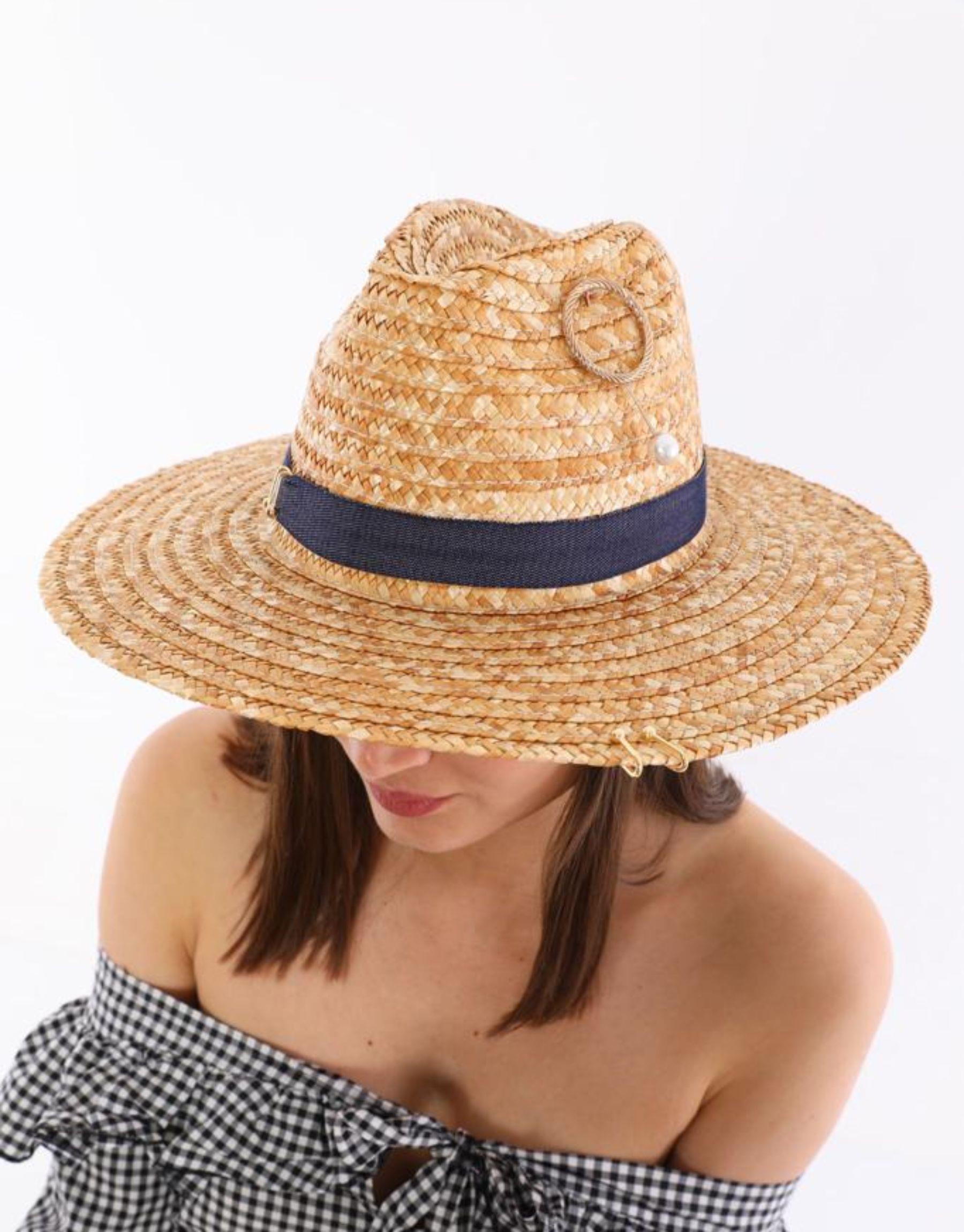 -Lacivert denim kuşaklı gold ve inci detaylı hasır şapka.