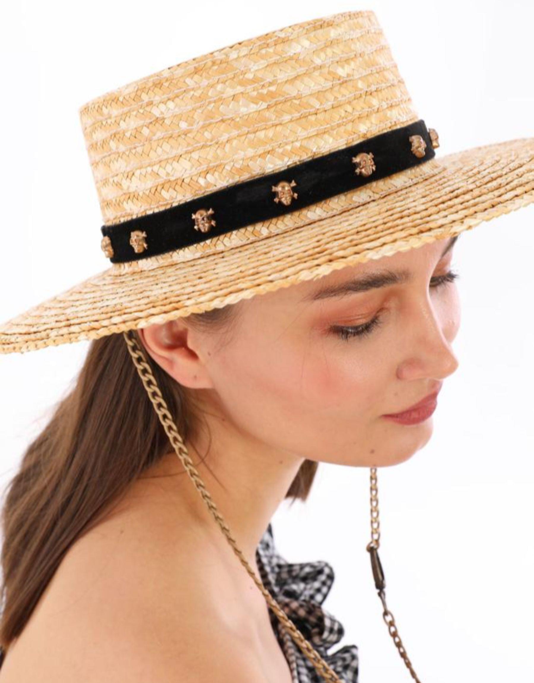 -Boyun altından gelen antik gold zincir ile hasır şapka.