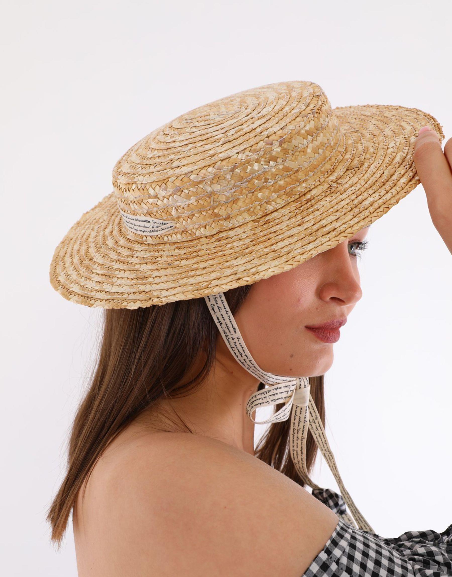 -Beyaz üzeri siyah yazı detaylı boyun altından bağlamalı hasır şapka.